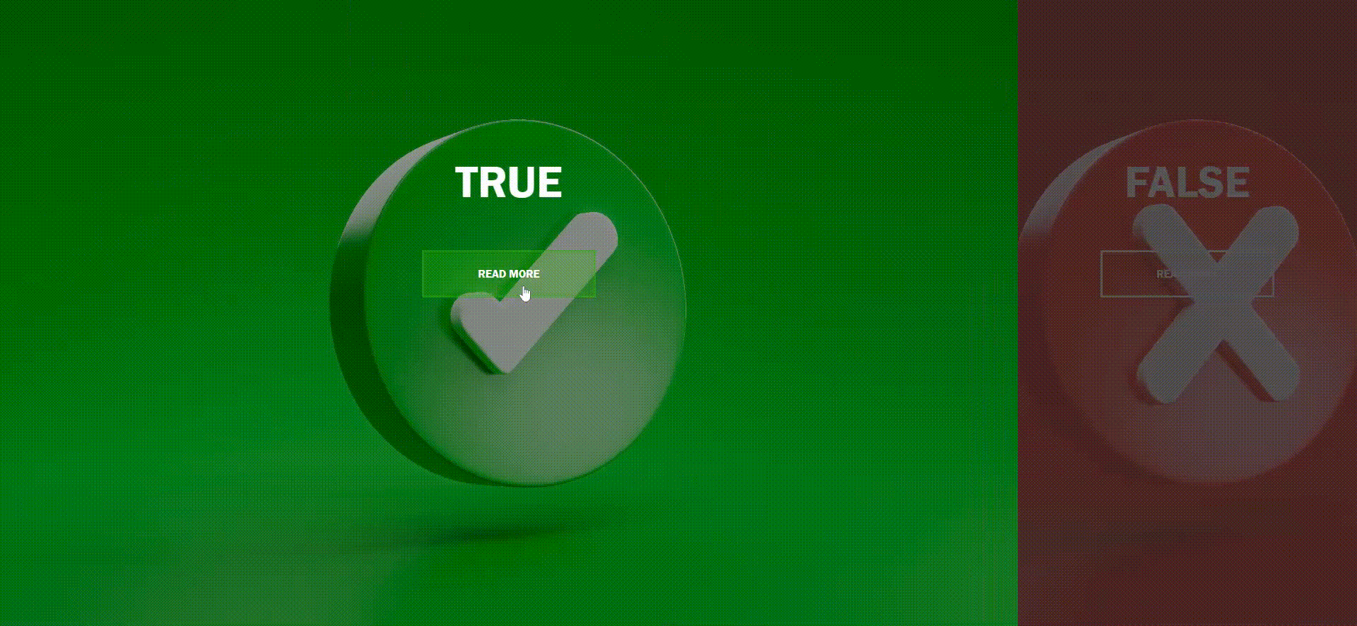 Each split <div> contains an <h1> element displaying “TRUE” and “FALSE” headings, accompanied by an anchor (<a>) element with the class “button” labeled “Read More.” These elements play a crucial role in presenting content and creating interactive links.